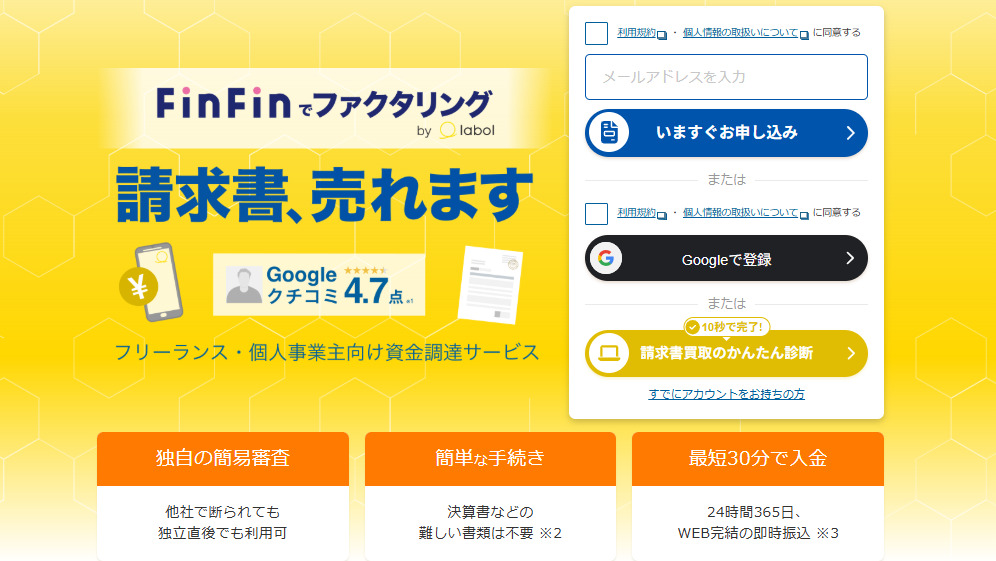 FinFinでファクタリング by labolは、フリーランス・個人事業主に特化したサービスです。