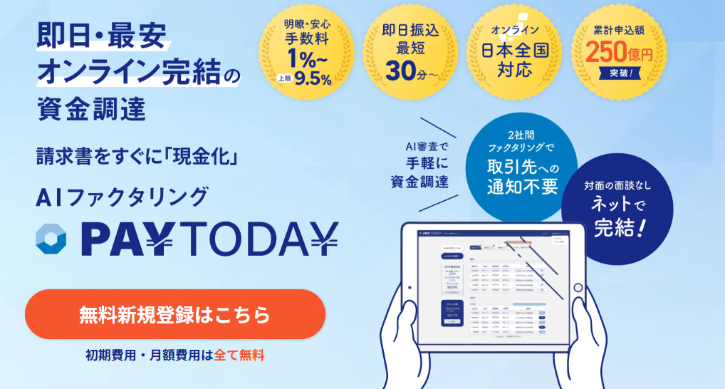 PayTodayは、個人事業主・法人ともに利用できる、オンライン完結型のファクタリングサービスです。